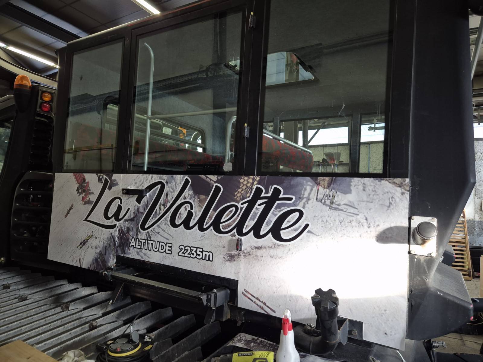 Le rendu est assez impressionnant et sort un peu de l ordinaire car le covering d une dameuse est assez rare. Il a fallu respecter les formes de la carrosseries , réaliser de belles découpes sur les différentes portes.. Su les vitres nous avons posé des impressions numériques en microperforé pour que les clients à l intérieur puissent voir l extérieur.. et que de l extérieur nous ne voyons que le visuel imprimé..