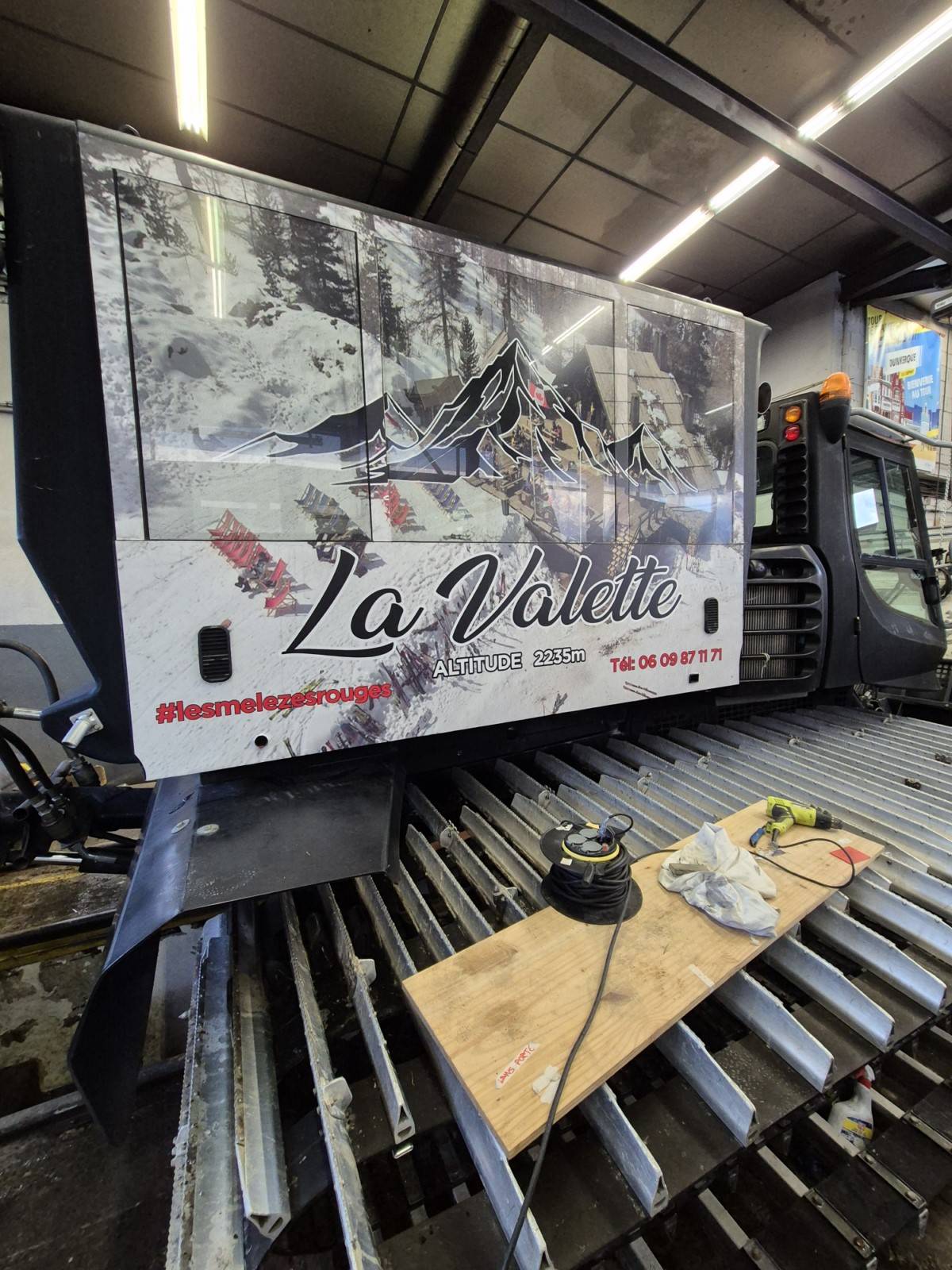 Notre client qui possède un restaurant ainsi qu un logement en altitude à Isola 2000 souhaitait que sa dameuse (qui sert au transport de ses clients) soit floquée à ses couleurs.